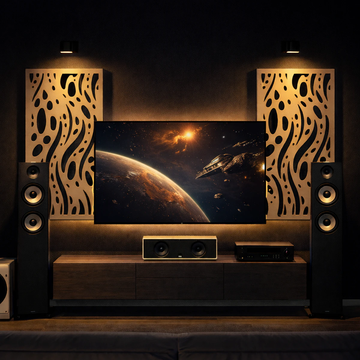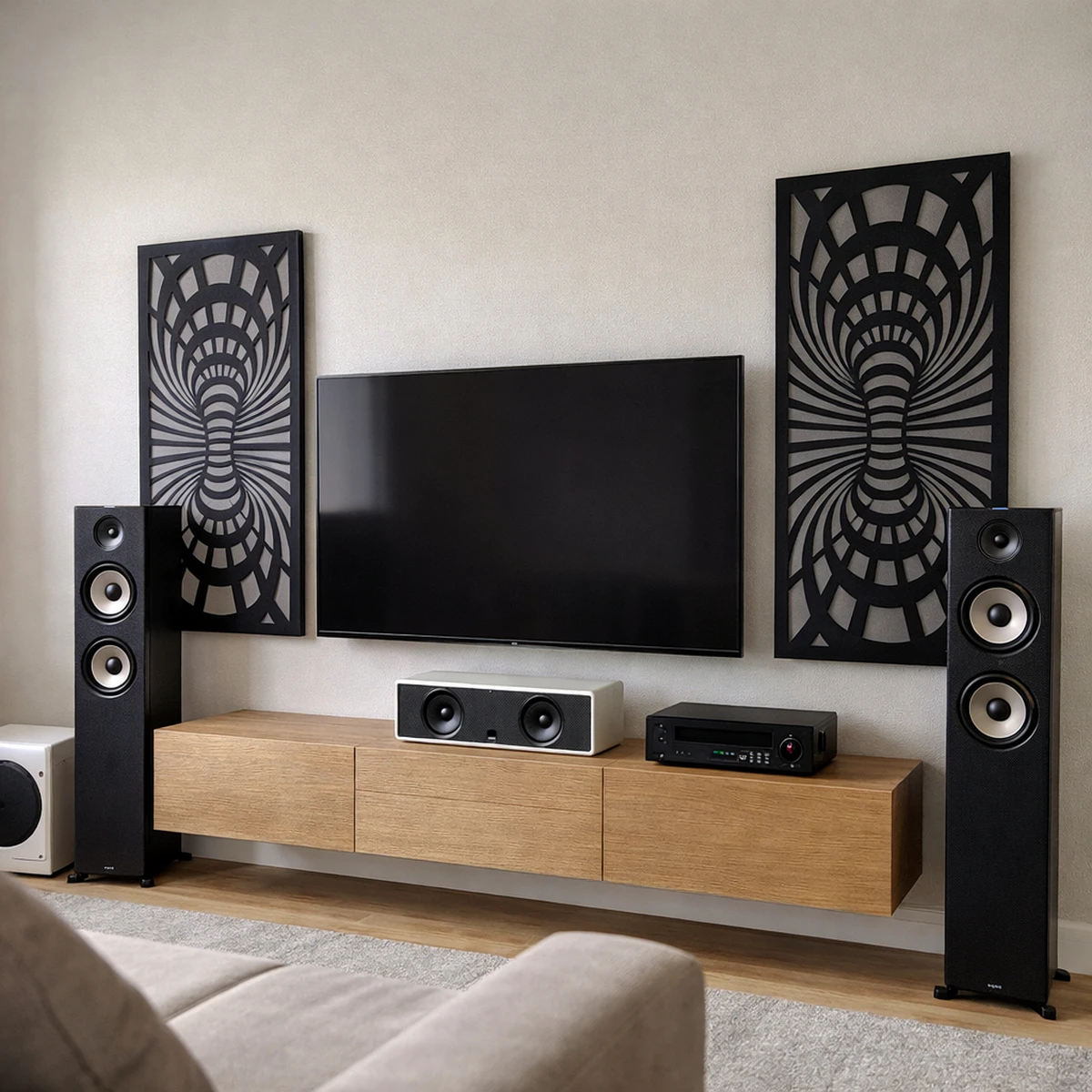 Vores akustiske diffusorer sikrer den mest effektive fordeling af lyden. Selv om lydoplevelsen altid er subjektiv, er alle enige om, at musikkens surroundlyd er mere levende og naturlig. Den bedste og mest jævne fordeling af lydfeltet i rummet eliminerer ubehagelige effekter, når lydene virker “skarpe” i højfrekvensområdet. Balanceret akustik opnås ved at montere lyddæmpende plader på væg og loft.